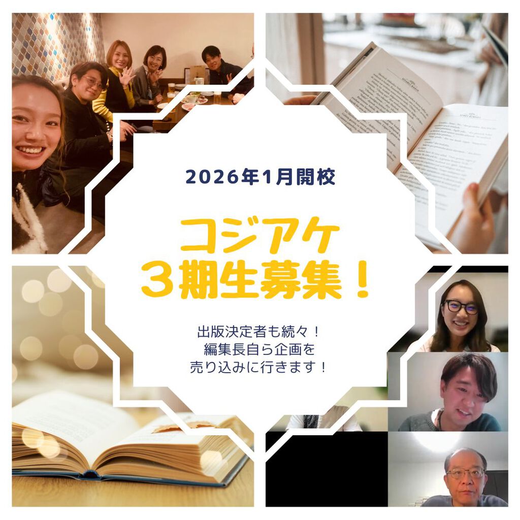 この塾では、出版を通じて「リベンジ」したいすべての人を全力で支援します。正直、キツイです。全然ぬるくないです。でも、大丈夫。「この野郎!精神」に自信のある方ならきっと乗り越えられるはずです。一緒に乗り越えましょう。夢の扉を、ともにコジアケる同志の挑戦をお待ちしております。